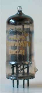 Dit is een vroege all-glass buis uit 1950, een dubbeldiode-triode met